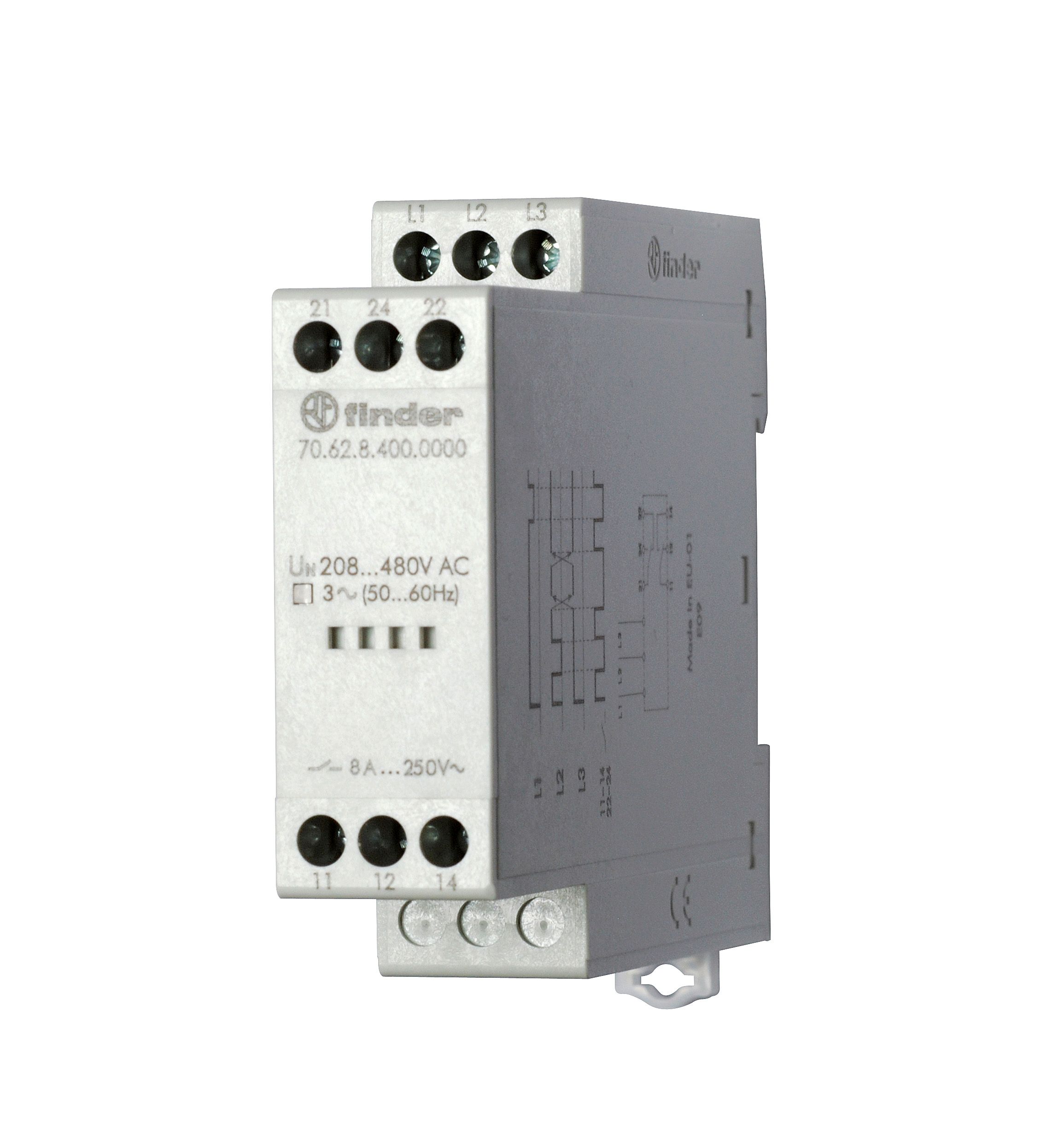 706284000000T, Контрольное реле для 3-фазных сетей; обрыв/чередование фаз, фиксированные регулировки; выход 2CO 8А; модульное, ширина 22.5мм; степень защиты IP20; специальная версия для Ж/Д-транспорта
